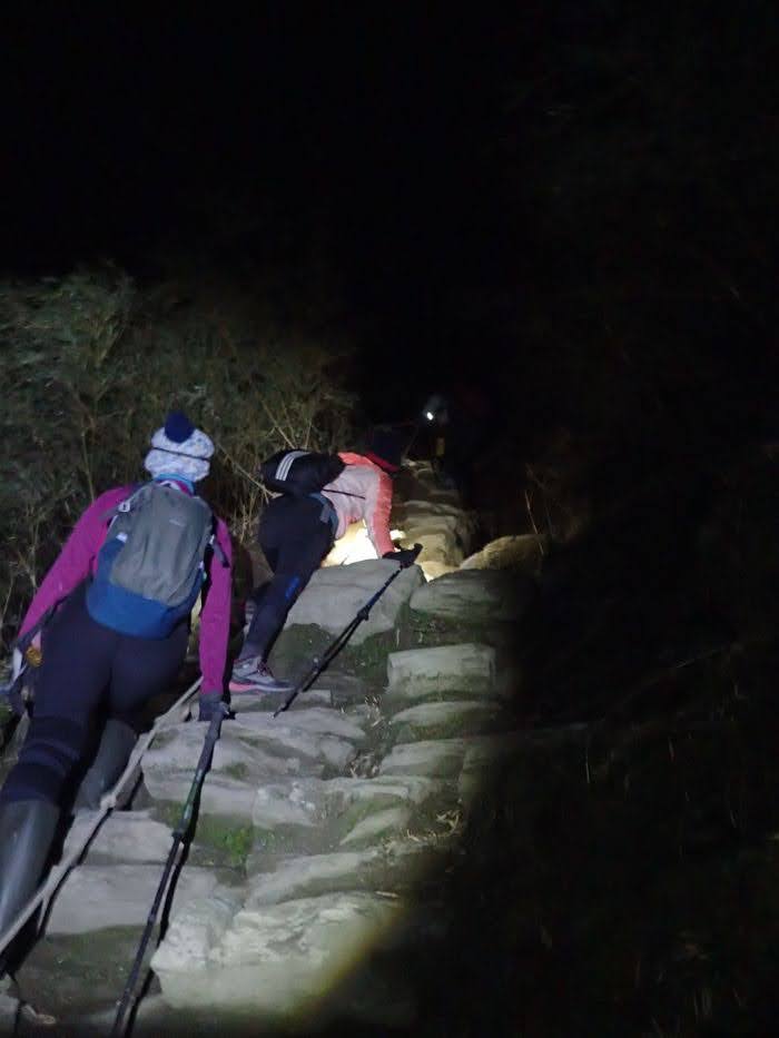 夜很黑,天空星星很亮,我們的頭燈也很亮,一盞一盞沿著陡坡往上排列,無聲移動,閃閃爍爍,我只記得路一直很陡,四周一片漆黑,跟著前面慢慢往上爬就是,偶爾抬頭看看星星,想像它們正在幫我們加油打氣。