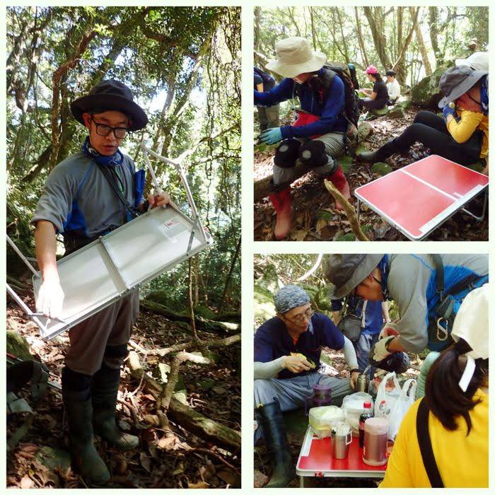 山坡上沒有平坦地,我們勉強湊合找地方坐下來,萬城從背包裡掏出他的新歡,可愛小摺疊桌,往地上一擺,瞬間我們一夥人的登山層次一下子拉升至Pro級。