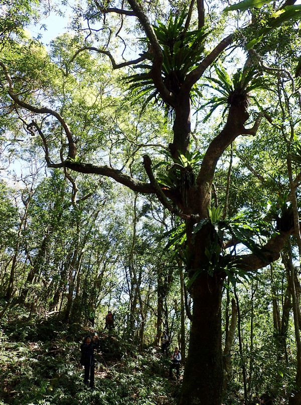 這陣子很乾爽,雖然看似沒有章法的雜木林,但高大巨木上掛著一叢叢鳥巢蕨很像花籃,綠意盎然,賞心悅目。